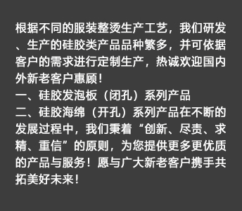 我公司生產的硅膠海綿(開孔)系列產品具有耐高溫、透氣性好、耐壓性強等優點,是西服及高檔服裝整燙生產的必備產品。硅膠發泡板(閉孔)系列產品具有發泡均勻,耐高溫、耐壓性能好,其中新研制開發的針孔浮點硅膠發泡板攻克了一般產品的浮點不飽滿的技術難題,一般產品的浮點不飽滿,容易擋住透氣孔,造成吸風效果不良。我司的產品具有更好的透氣性和回彈性,以及更長時間的試用壽命。